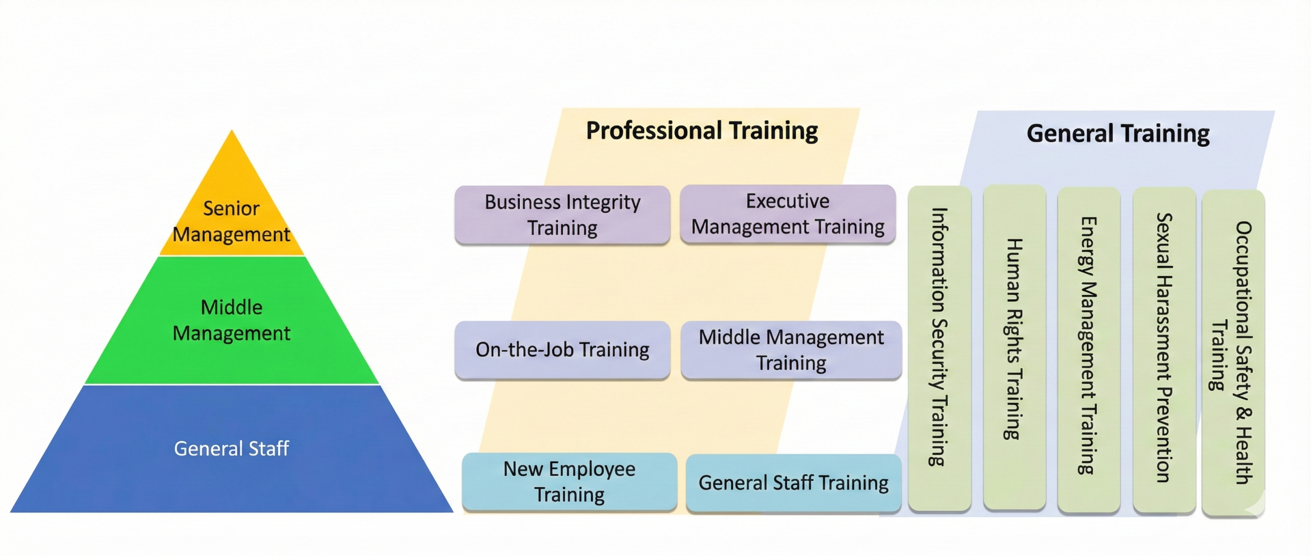 We customize training programs according to employee hierarchy. Entry-level training includes new employee orientation and general staff training; Middle management training focuses on the Leadership Development Program, covering functional expertise and management skills; Senior management training includes business integrity and executive management training. The training highlights for 2025 are as follows: