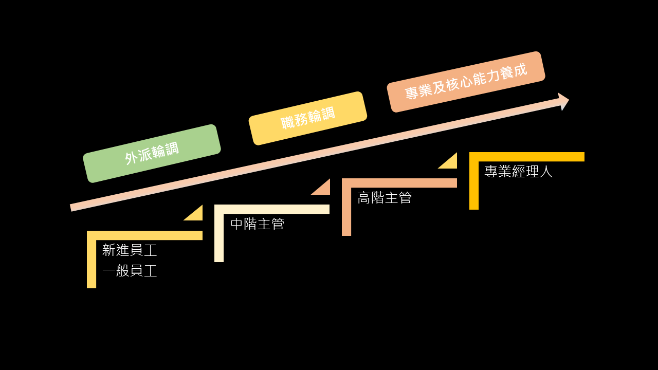 除了專業及核心能力的養成,也透過外派輪調、職務輪調的方式,鼓勵員工拓展多元的技能,累積跨領域的實戰經驗,全方位提升管理視野,協助員工在職涯發展上不斷成長。