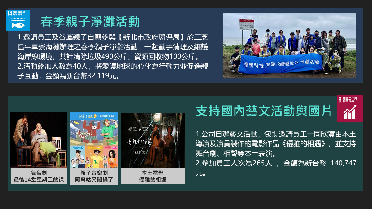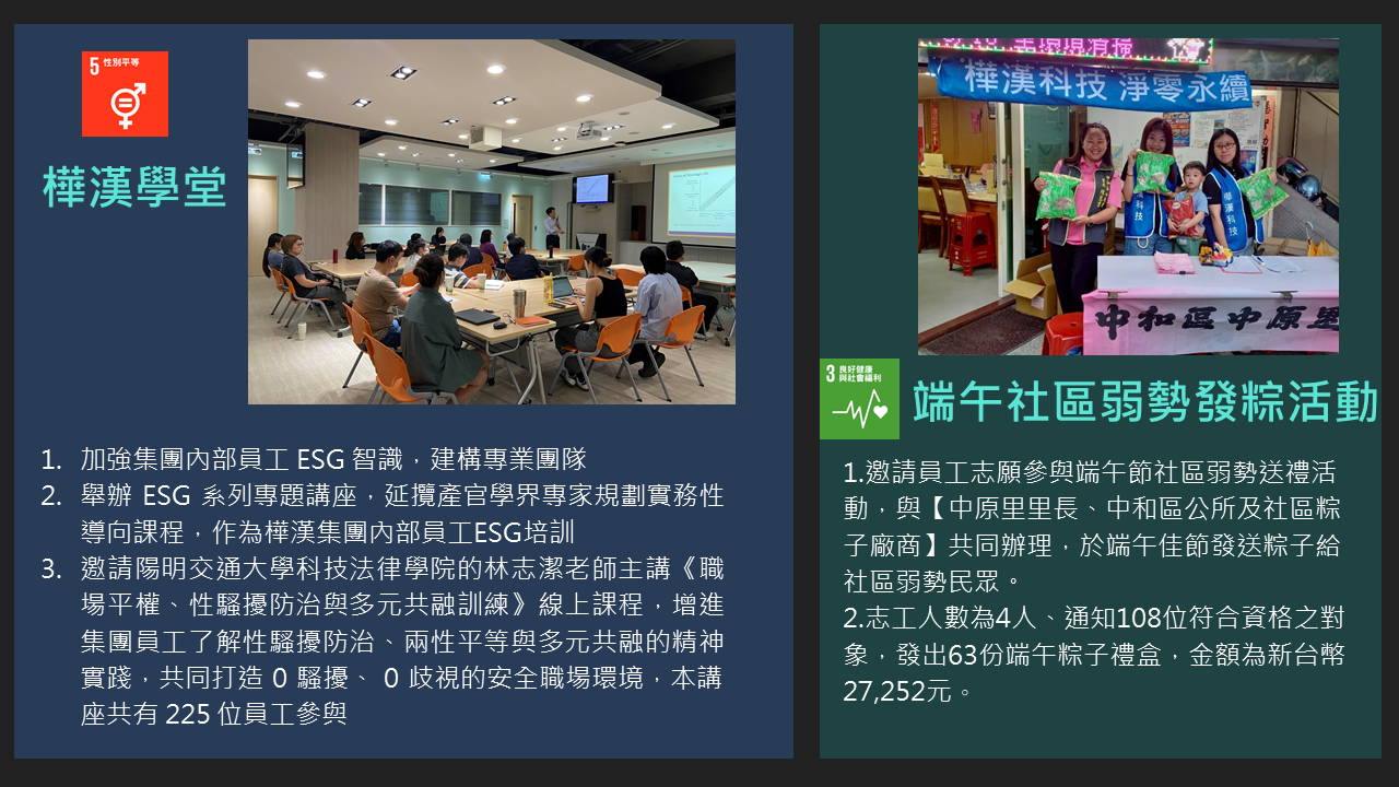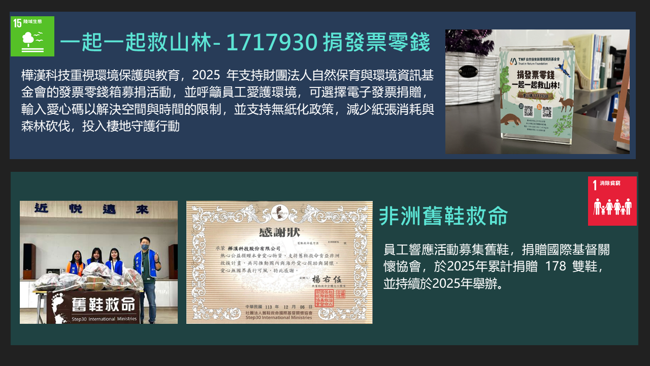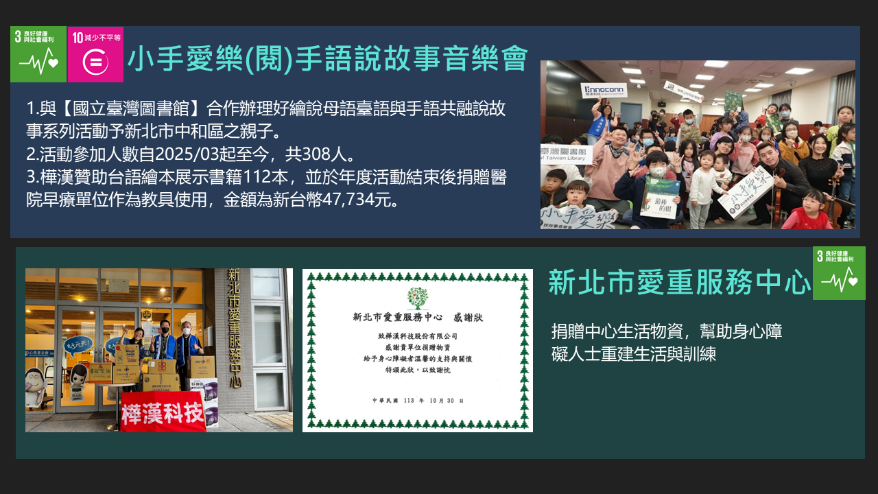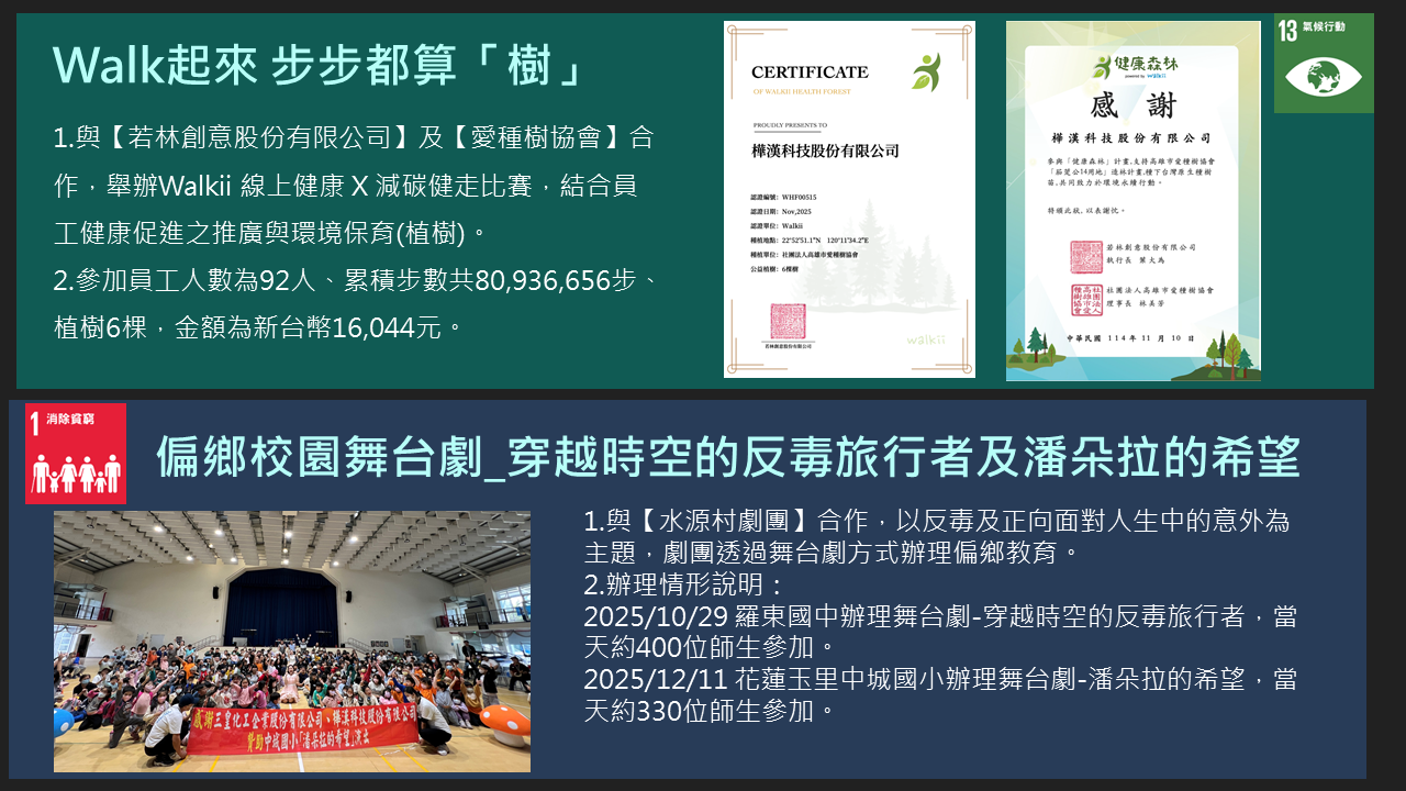 樺漢科技秉持著「取之社會,用之社會」的理念。在追求企業成長的同時,也持續致力於回饋社會,特別是公司所在地新北市。自2016年成立企業社會責任(CSR)團隊以來,樺漢科技每年積極舉辦並參與各類社會公益及環境保護活動,包括淨灘與社區服務等。此外,公司也定期捐贈物資、新鮮水果與書籍給當地的社福機構與社區居民,展現對弱勢族群持續的關懷與支持。