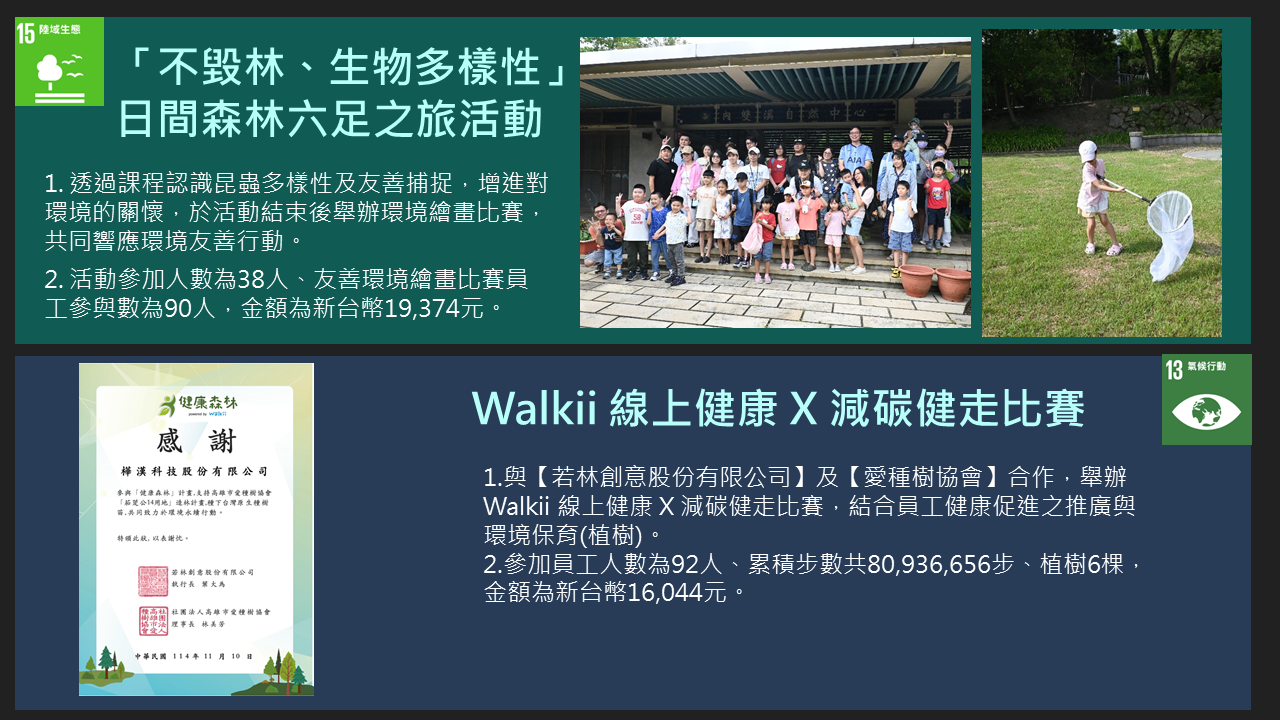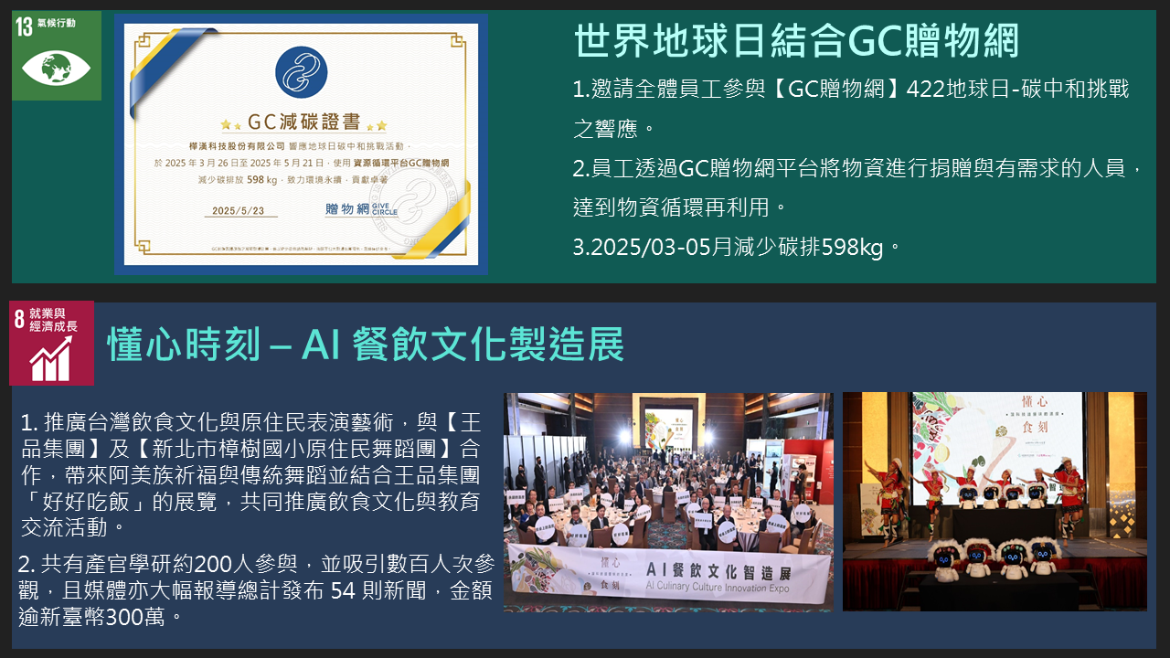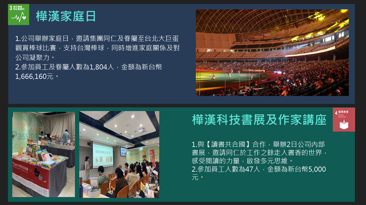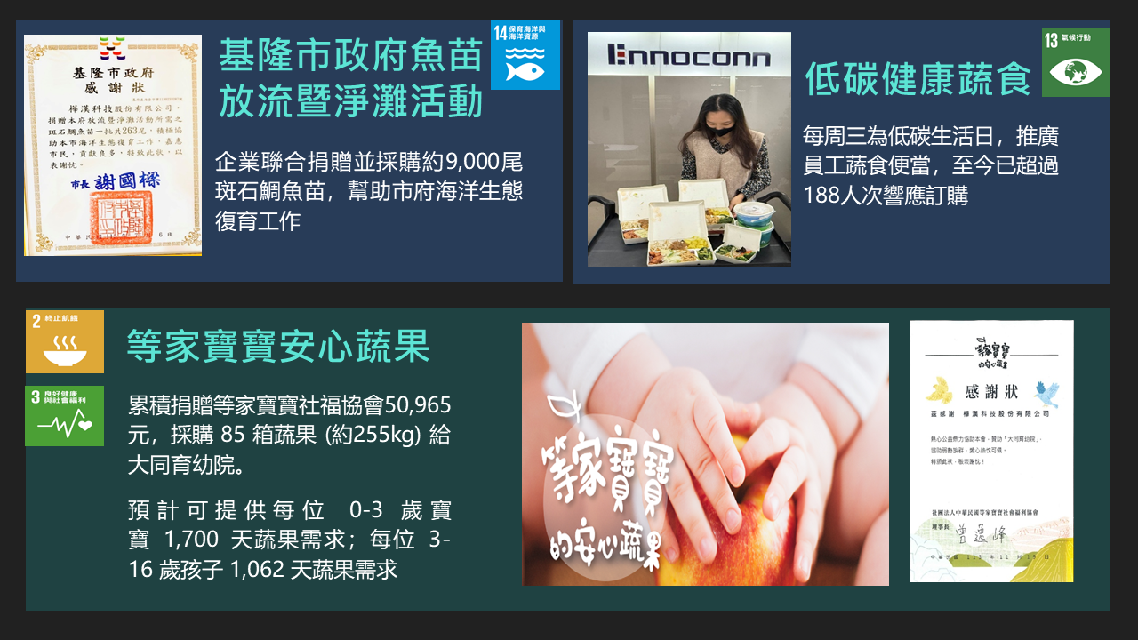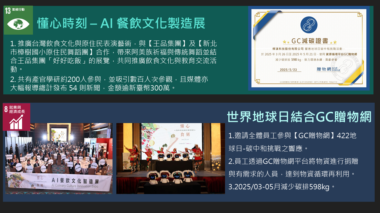樺漢科技秉持著「取之社會,用之社會」的理念。在追求企業成長的同時,也持續致力於回饋社會,特別是公司所在地新北市。自2016年成立企業社會責任(CSR)團隊以來,樺漢科技每年積極舉辦並參與各類社會公益及環境保護活動,包括淨灘與社區服務等。此外,公司也定期捐贈物資、新鮮水果與書籍給當地的社福機構與社區居民,展現對弱勢族群持續的關懷與支持。