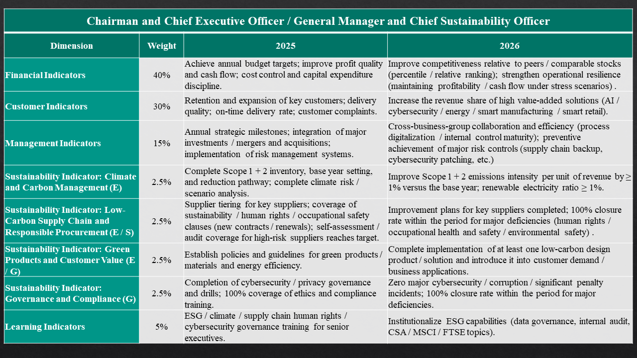 对于最高决策层,评估指标包括:财务指标(权重40%)、客户指标(权重30%)、管理指标(权重15%)以及可持续发展与学习指标(权重15%)。 2025年,董事长兼首席执行官带领团队完成了范围1+2温室气体清单及减排路径规划,并对主要供应商实施了可持续发展与人权条款的覆盖。