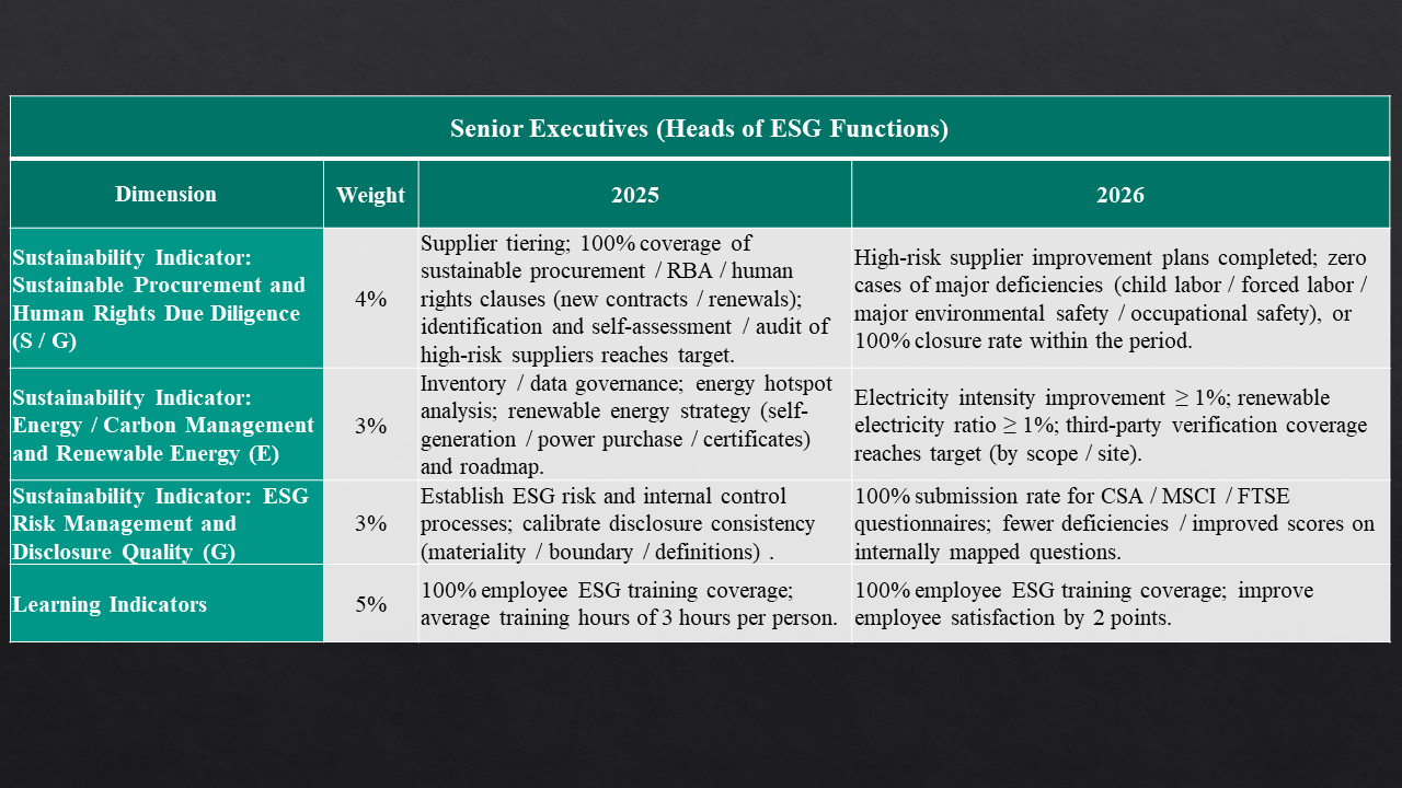 2026年,管理层的评估重点将包括:每年至少减少1%的范围1和范围2碳排放量,实现至少1%的可再生电力占比,推动至少一项低碳设计产品解决方案的落地,以及提升国际ESG问卷评估的得分。这些目标彰显了公司对可持续转型的承诺。